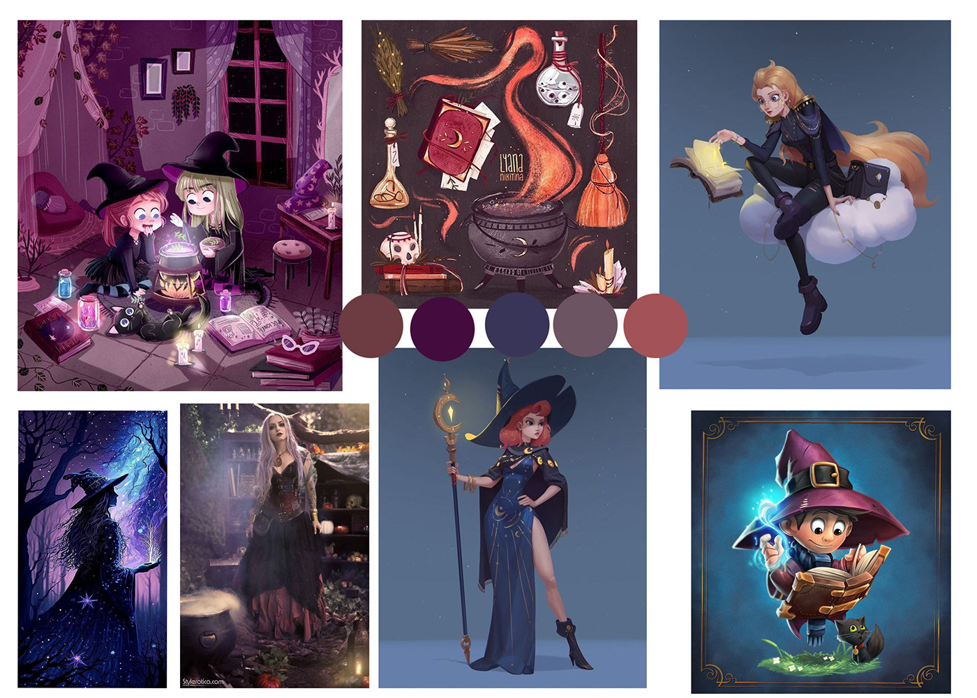 Para confeccionar mi ilustración, en su totalidad, creé un moodboard, el cual me sirvió para tener ideas sobre: la confección de los objetos, como el caldero, los frascos, libros y la vestimenta. Como asi también, me ayudó para confeccionar la pose de mi personaje.