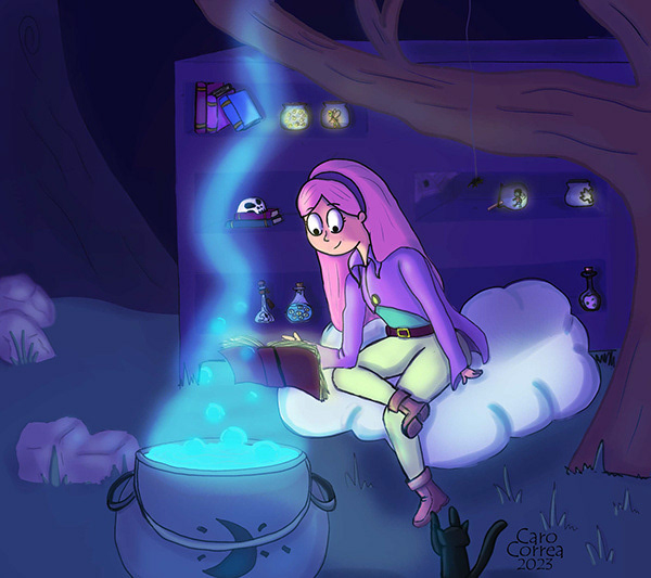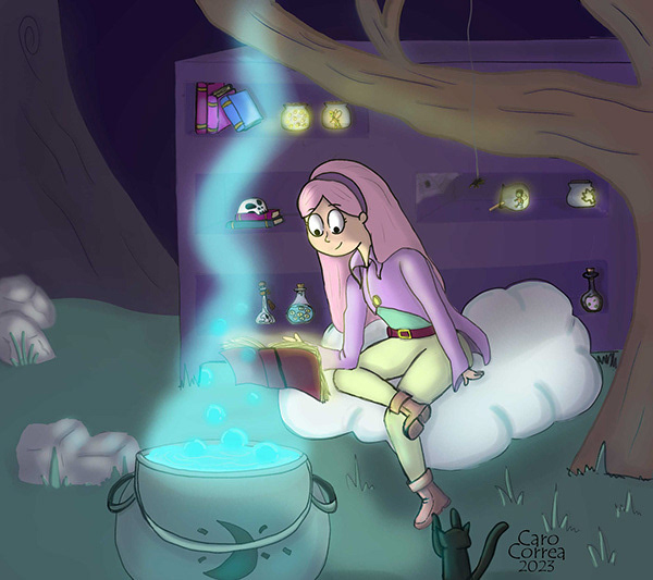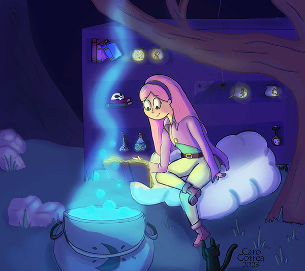 Al tratarse de una luz fuerte, ya que el personaje se encuentra cerca de los objetos luminosos, se puede apreciar las distintas tonalidades de la luz, tanto del libro como del caldero, generando de esta forma una mayor atención en el personaje. Por último le incorporé color al personaje y a los objetos iluminados para avivar aun más la ilustración.