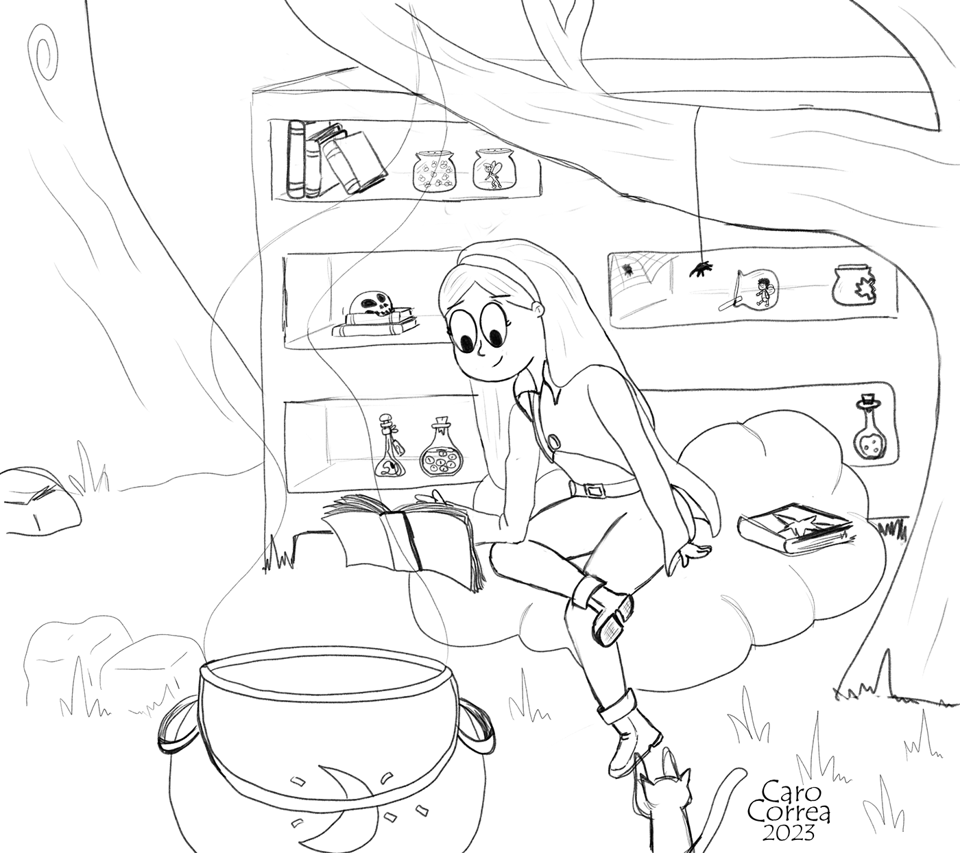Para la selección del personaje me basé en la hechicería, creando de esa forma una niña, pre-adolescente, ya que la idea de mis ilustraciones se basan en libros infantiles o juveniles. Por ende mi dibujo se compone de líneas curvas dando un aspecto amigable y suave.